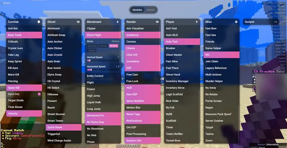 Ambient is a comprehensive Minecraft client that provides access to over 50 unique features across 7 main categories, including Movement, PvP Combat, Render, Ghost, Player, Scripts, and Misc.