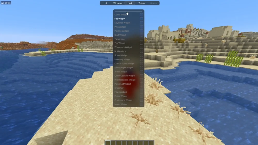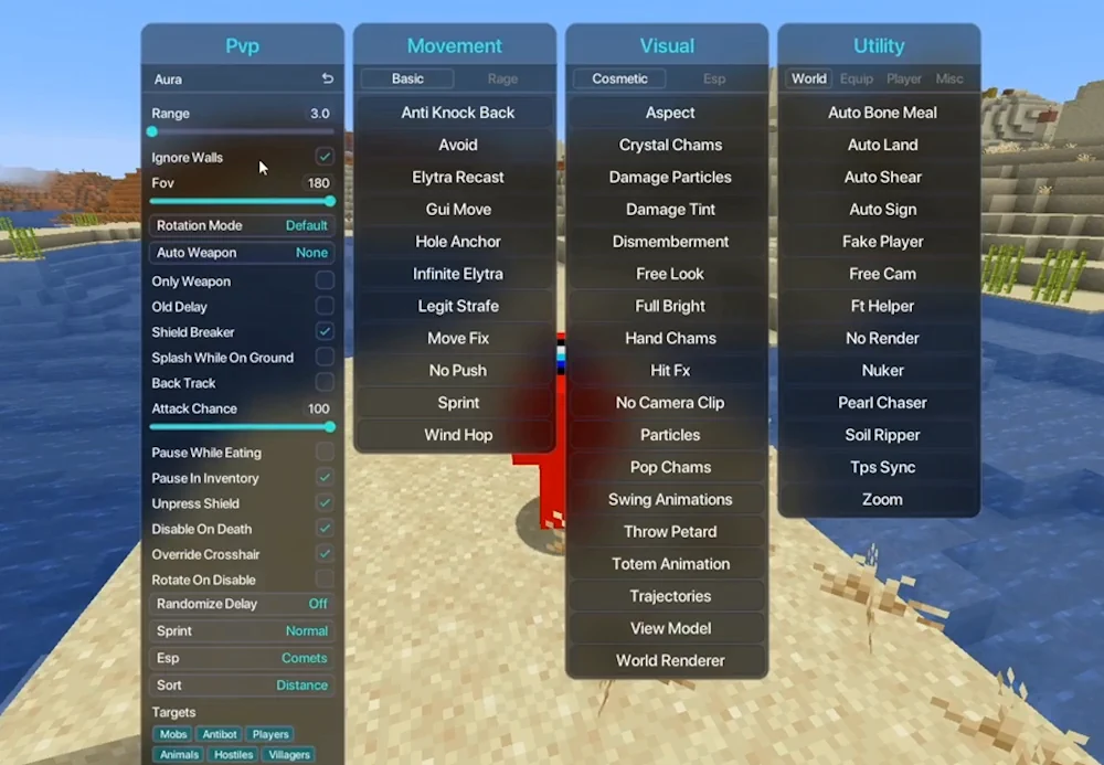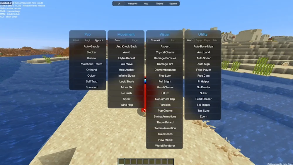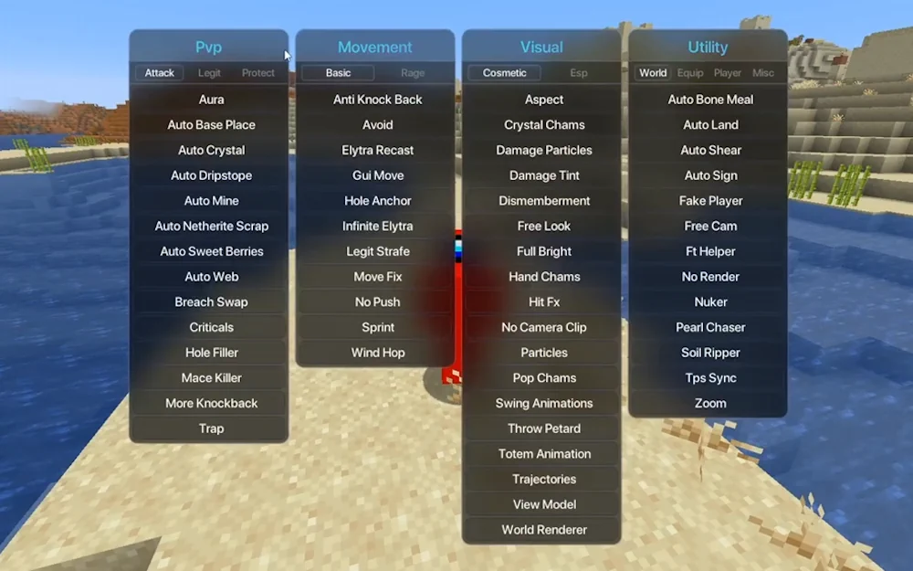 The client includes more than 40 unique features, organized into clear categories such as combat, movement, building, and more. This layout makes it easy to find and enable exactly what you need without wasting time. The main focus is on PvP, combat scenarios, and minigames, but the client is also flexible enough for different playstyles. In total, you get access to over 150 modules, all managed through a simple yet advanced menu system.